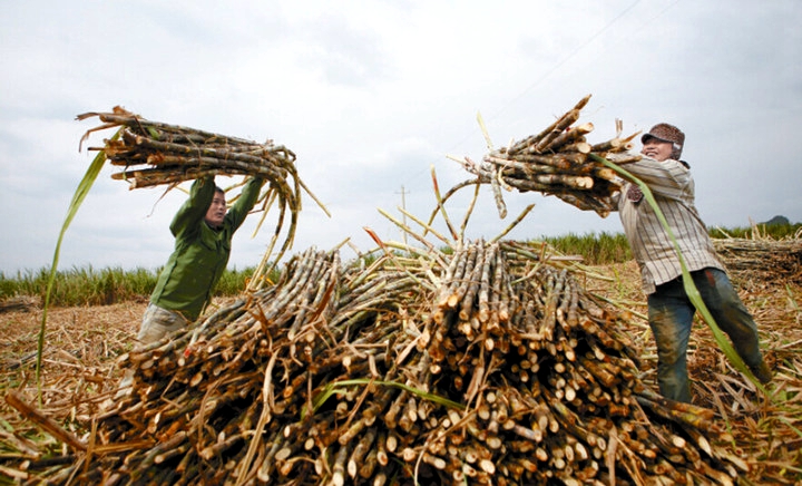 圖為糖料蔗種植基地的工人將捆扎好的甘蔗搬運(yùn)到地頭